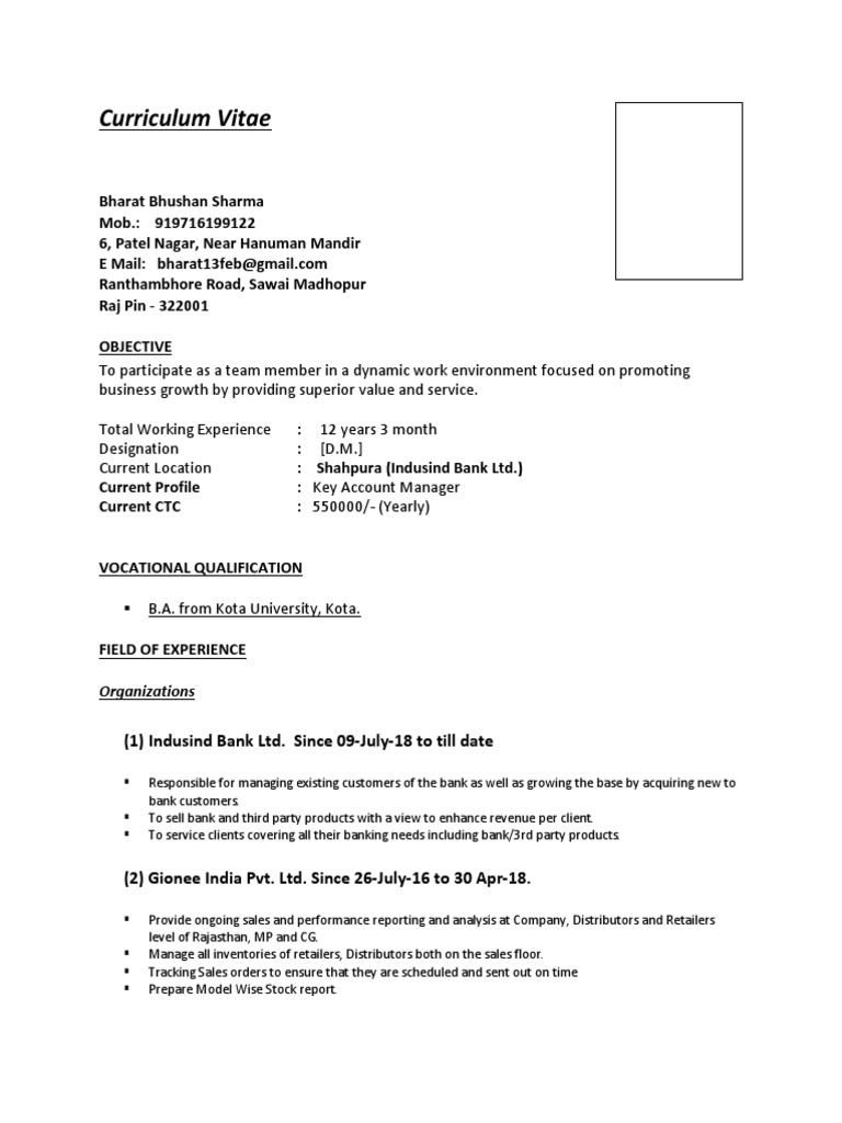 Curriculum Vitae 1 Indusind Bank Ltd Since 09 July 18 To Till